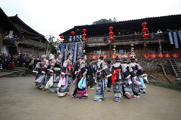 Miao villagers perform the bronze-drum dance in the Miao village of Jijia in Zhengguang village, Danzhai county, Southwest China's Guizhou province. [Photo by Huang Xiaohai/For chinadaily.com.cn]
