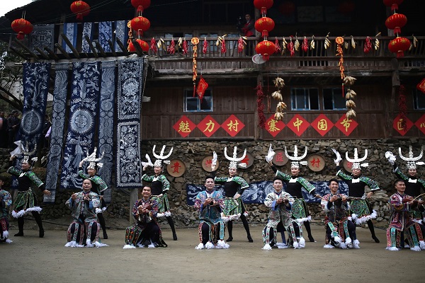 Cultural volunteers perform ancient Miao dance in the Miao village of Jijia in Zhengguang village, Danzhai county, Southwest China's Guizhou province. [Photo by Huang Xiaohai/For chinadaily.com.cn]