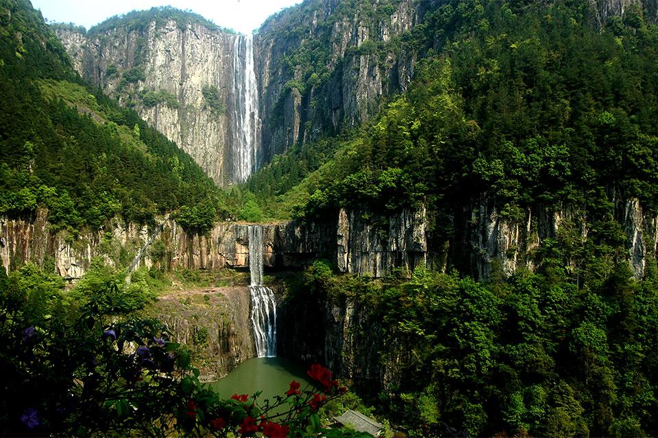 Baizhang Waterfalls was formed by a convergence of rivers in the local area of Nantian. The water pours down from steep cliffs more than 600 meters in height and rushes through the deep gully, forming three-stepped cascades with a total drop of 353 meters, and single-fall drop of 207 meters. In 2013, it was certified as a “waterfall with the highest single-fall drop in China” and was selected as one of “China’s top 10 famous waterfalls”.