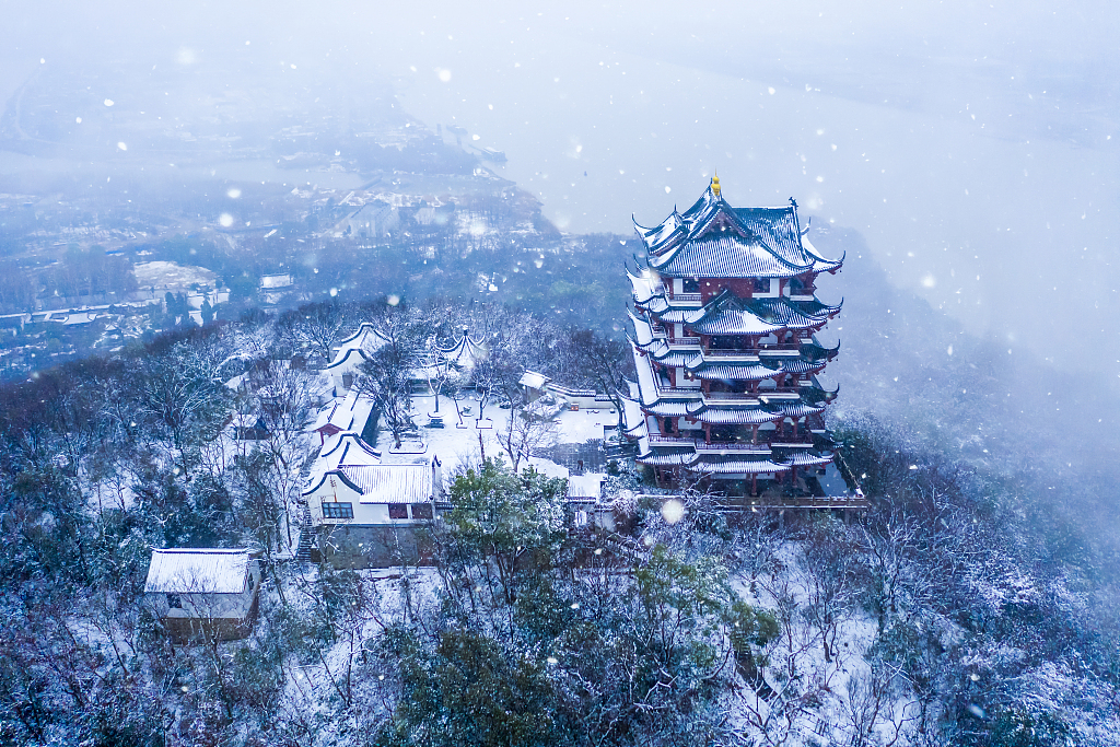 Hebao Mountain, commonly known as Baoji Mountain, is adjacent to the Caishiji Scenic Area to the south, the Wangfu Mountain to the north, and the Yangtze River to the west. Halfway up of the mountain is the Yugong pavilion, a double hexagonal pavilion with cornices and an extraordinary atmosphere.
