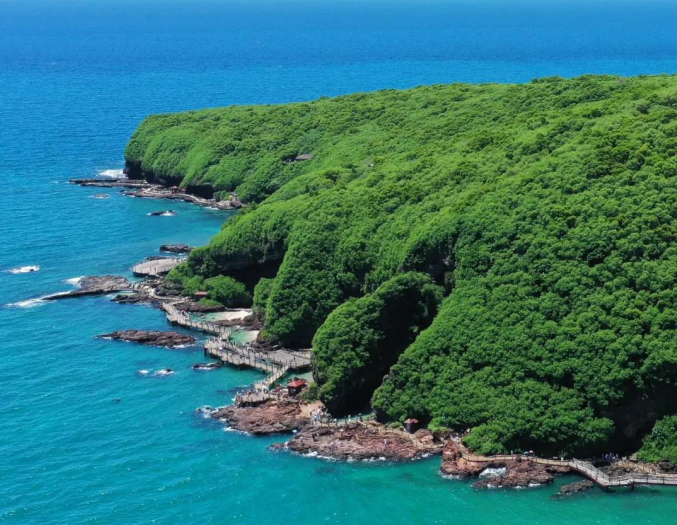 Covering 3.8 square kilometers, the South Bay Crocodile Mountain Scenic Area of Weizhou Island is home to Crocodile Mountain, the Five-Color Beach, the Red Square, and the Nanwan Ocean Sports Park. Thanks to its stunning island landscapes, typical volcanic geological relics, odd sea erosion landscapes, rich ecological tourism resources, and warm climate, this scenic spot is renowned at home and abroad.