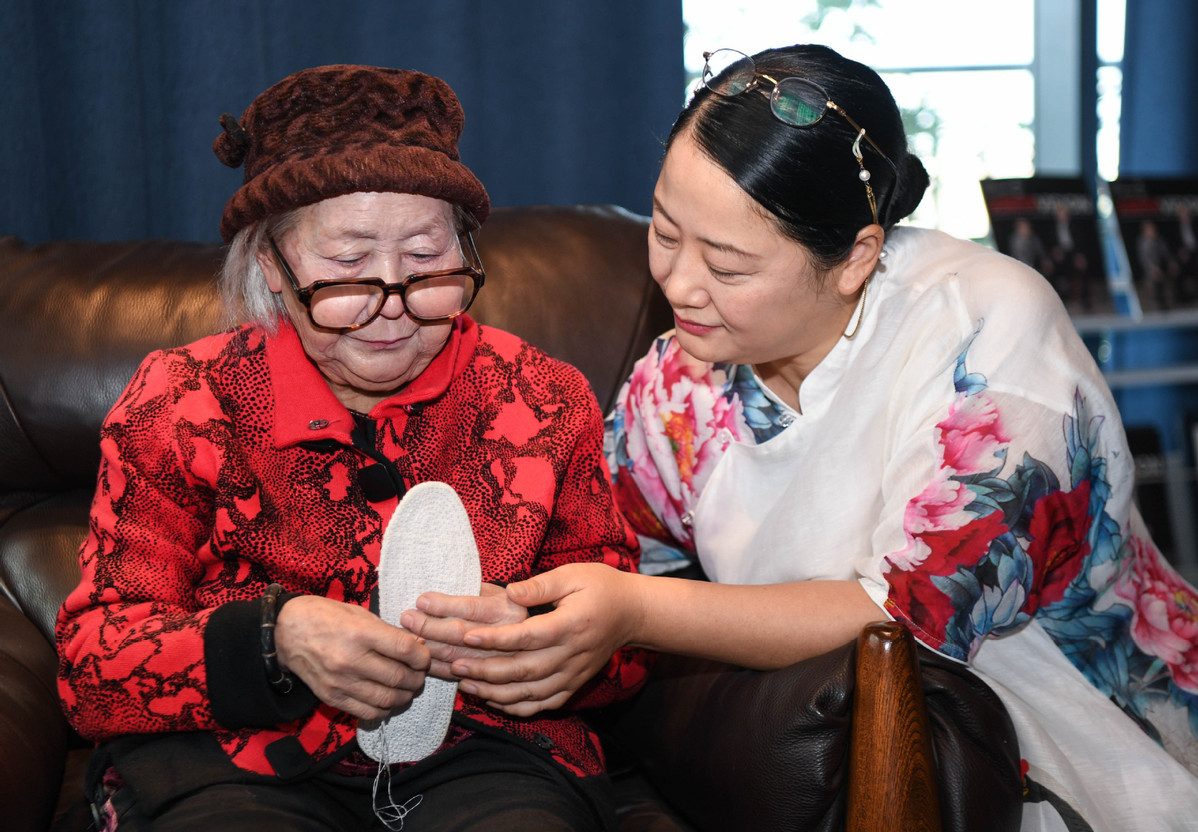Zhou Xuerong takes a group photo with a wax figure "Grandma". This waxwork was based on Zhou Xuerong's grandmother. [Photo/Xinhua]