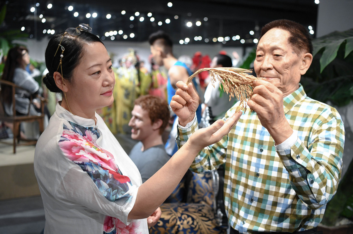 Zhou Xuerong arranges the rice props for a waxwork replica of Yuan Longping on Feb 8, 2021. [Photo/Xinhua]