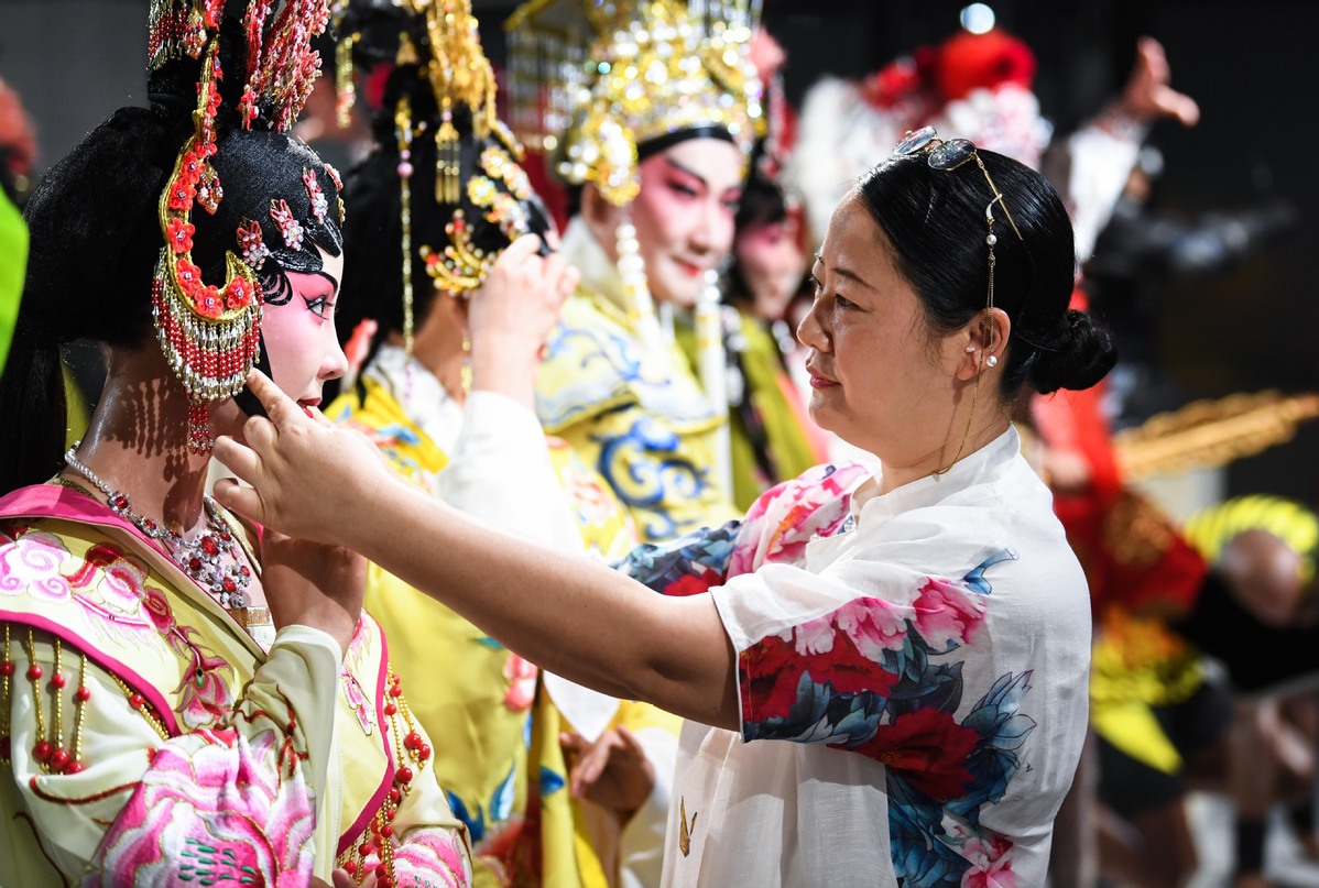 Zhou Xuerong adjusts the costumes of wax figures of Cantonese opera characters on Feb 8, 2021. [Photo/Xinhua]