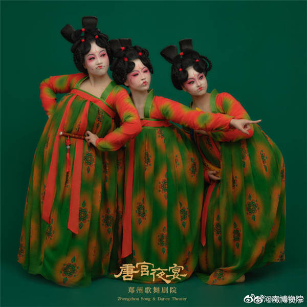 Fourteen dancers wearing jumpsuits filled with sponge and with special cotton in their mouths recreate the plump figures of Tang Dynasty females. Besides, crescent-shaped makeup and costumes resembling Tang tri-colored pottery make audiences feel like travelling to the Tang Dynasty 1,300 years ago.