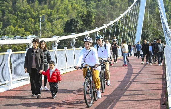 People embrace the spring season and improve their own health by cycling or taking a walk along a pathway encircling Qiandao Lake in Chun'an county on Feb 17. [Photo/CFP]