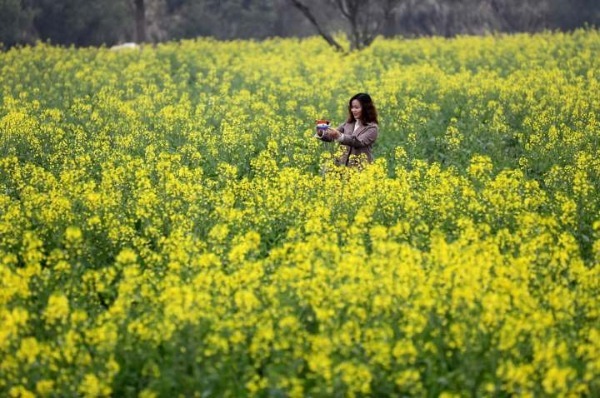 A woman takes a selfie surrounded by acres of rapeseed flowers in Zhijiang village, Jiande on Feb 17. The flower field is nestled by the Xin'an River, which has been put into key protection in recent years. [Photo/zjol.com.cn]