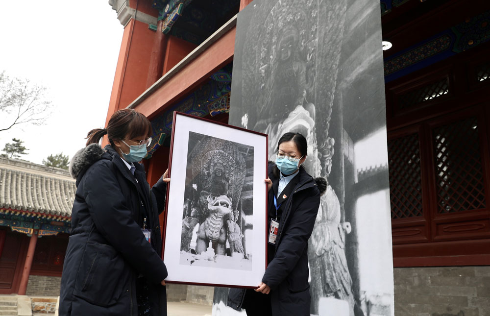 Workers from the administration of Yuanmingyuan Ruins Park exhibit a photo from the 1920s that features a statue of Manjusri Bodhisattva, a Buddhist deity, at Zhengjue Temple in Beijing on Wednesday. [Photo by Zou Hong/China Daily]