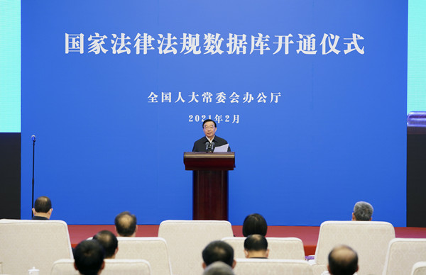 BEIJING -- A senior Chinese official on Wednesday highlighted the importance of the construction and application of a national database of laws and regulations to advance the rule of law in China.