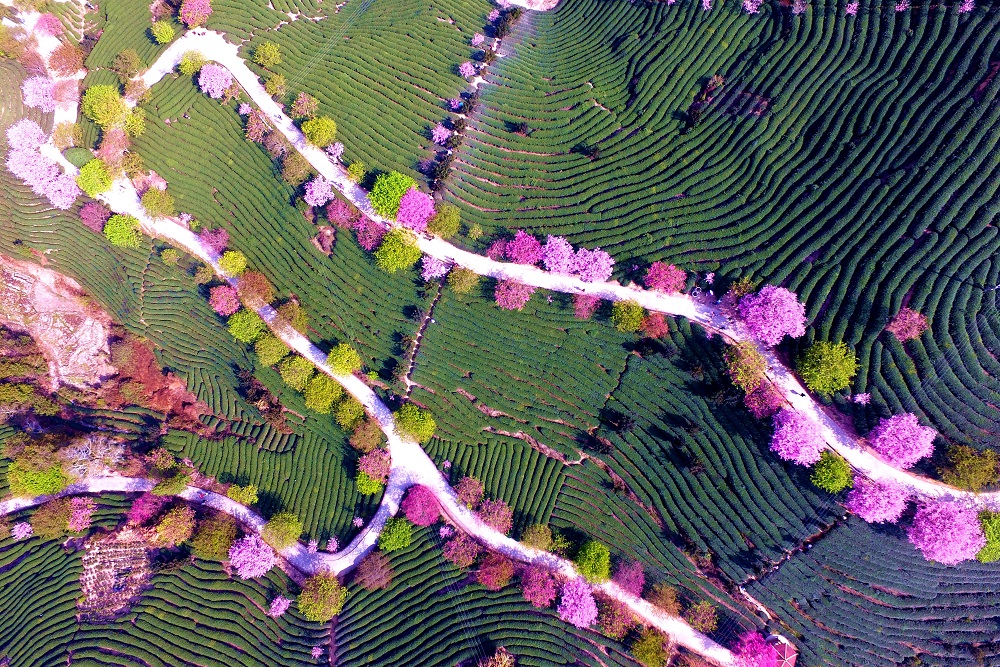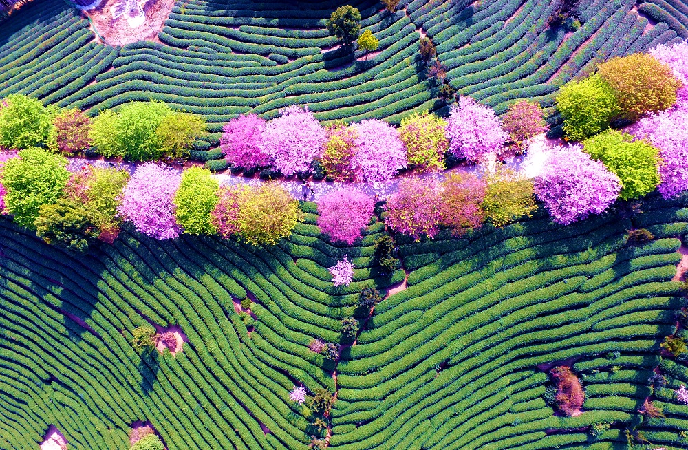 Don’t you want to have a closer look at this "pink necklace"? You’ll surely be surprised to learn that it’s "made of" more than 40 types of cherry blossoms at Taipin Yinghua Tea Garden in Zhangping, Fujian province! Sheltering the tea plants from the sunlight, the flowers also make an enchanting landscape in the springtime.
