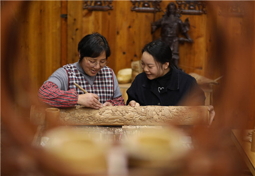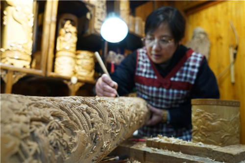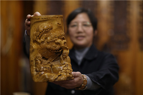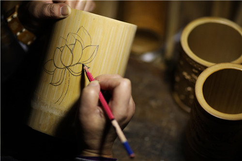 In the 1990s, Lu came to Chishui, Southwest China's Guizhou province, and fell in love with bamboo carving. She integrated Dongyang wood carving techniques into Chishui bamboo carving, creating patterns of mountains and rivers, insects and fish, flowers and plants, human figures and animals, which were well received by consumers.