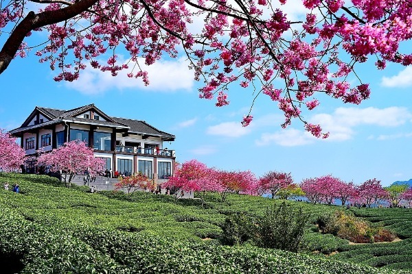 Cherry trees in Fujian's tea garden enter peak viewing season