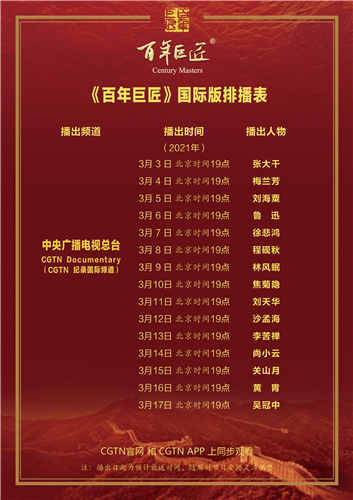 The international version of the docuseries Century Masters will be available on the CGTN Documentary Channel starting at 7 pm on March 3, airing one episode every night for 15 consecutive days.