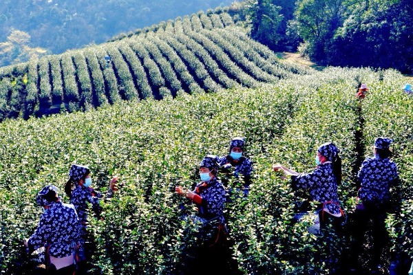 Farmers on Fuquan Mountain in Ningbo, East China's Zhejiang province, start picking tea on Feb 21. [Photo provided to chinadaily.com.cn]