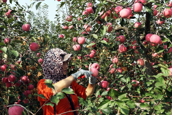 A farmer picks apples at an orchard in Yantai. The Yantai apple is bright in color and has a sweet and succulent taste. [Photo/VCG]