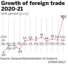 The encouraging trade figures are partly due to the lower base from the first two months of last year, when China's foreign trade was affected by COVID-19 outbreaks, he said.