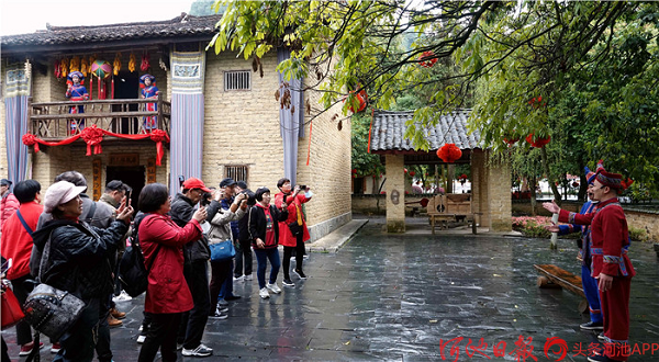 Liuhe village of Yizhou district in Hechi welcomed numerous tourists from places like Shanghai and Hangzhou, Zhejiang province on March 6, bringing hustle and bustle to the village.