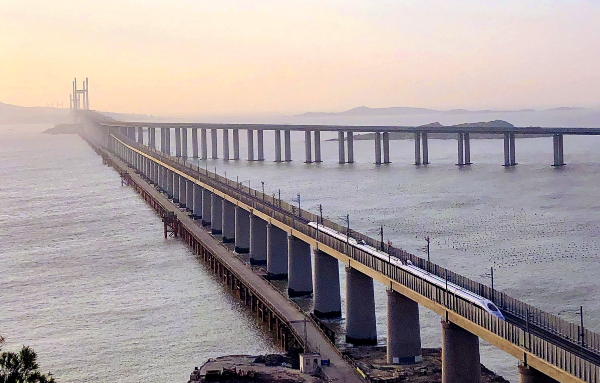 A train travels on the Pingtan Haixia Rail-Road Bridge of the Fuzhou-Pingtan Railway on Saturday. HU GUOLIN/FOR CHINA DAILY