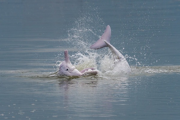 A pair of Chinese Indo-Pacific humpback dolphins, a rare variety of whale included on the national list of key protected wild animals, frolic in the ocean off the coast of Nanwan village in Ningde's Xiapu county, East China's Fujian province on March 1. [Photo/VCG]