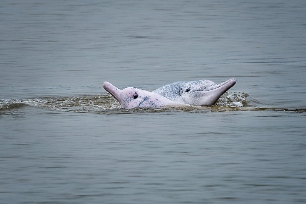 A pair of Chinese Indo-Pacific humpback dolphins, a rare variety of whale included on the national list of key protected wild animals, frolic in the ocean off the coast of Nanwan village in Ningde's Xiapu county, East China's Fujian province on March 1. [Photo/VCG]