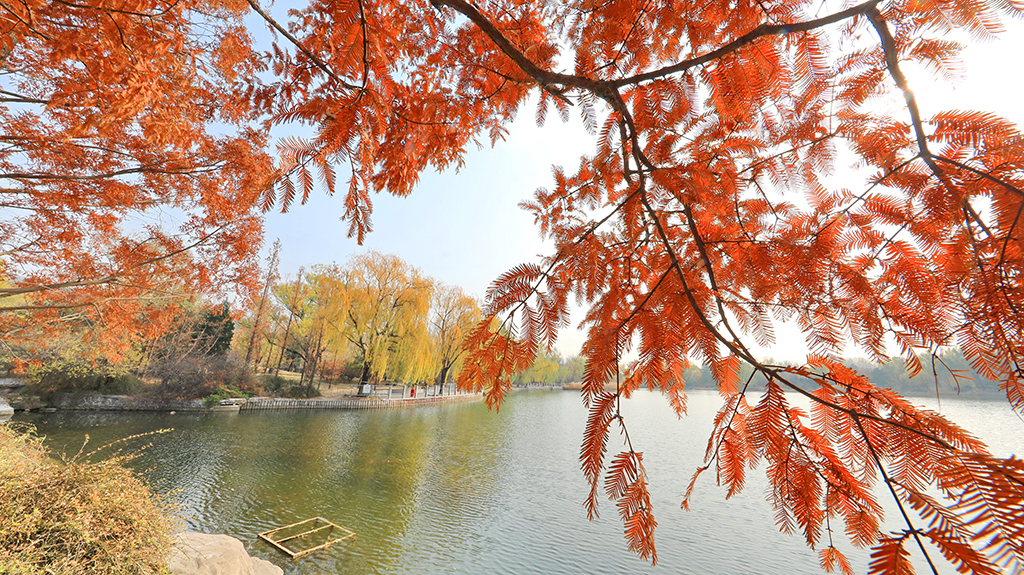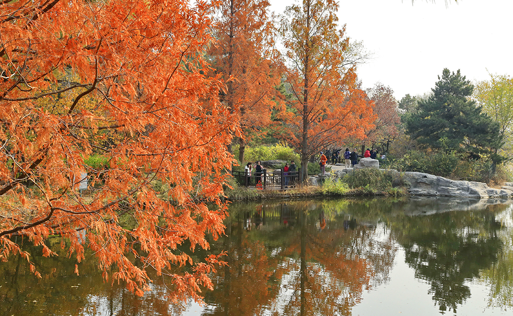 In the Cherry Vale of Beijing Botanical Garden, there are more than 180 dawn redwood trees. In the autumn, their golden dazzling leaves exude their charms in bright sunshine, drawing many local residents to enjoy the sight while wandering along a rustic plank road.