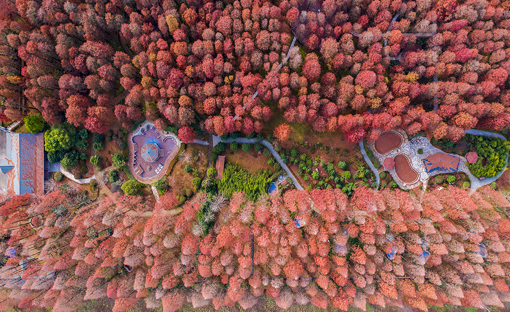 In the Sihong Hongze Lake Wetland Scenic Area, East China’s Jiangsu province, the dawn redwood forest is dressed in gorgeous colors in early winter. From an aerial view, it looks like a spectacular red ocean. In recent years, relying on its dawn redwood resources, Sihong county has integrated forests with tourism to develop rural tourism. Covering 20 hectares , the dawn redwood forest in the scenic area is a heaven for wild animals and draws many nesting migratory birds.