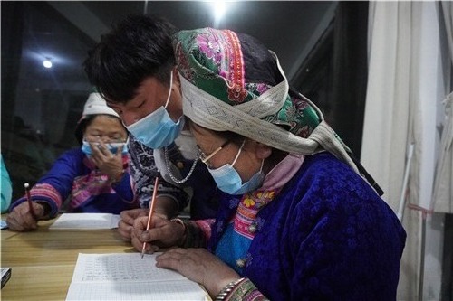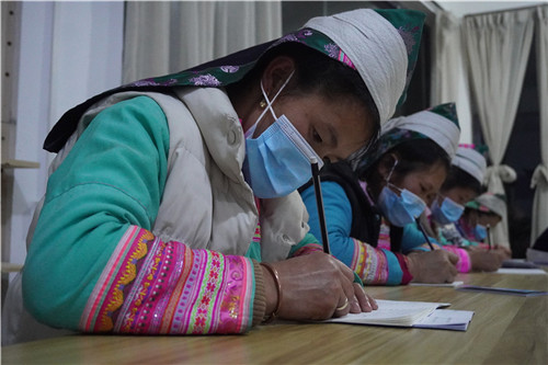 Wearing Miao clothing, women in Gaoya Village learn to write Chinese characters. [Provided to chinadaily.com.cn]