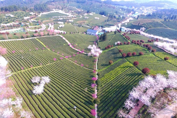 Cherry blossoms decorate a tea garden in Yuqing county, Guizhou province. [Photo provided to chinadaily.com.cn]