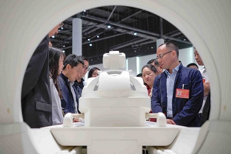 Visitors check out medical equipment during an exhibition in Guiyang, Guizhou province. HE JUNYI/CHINA NEWS SERVICE