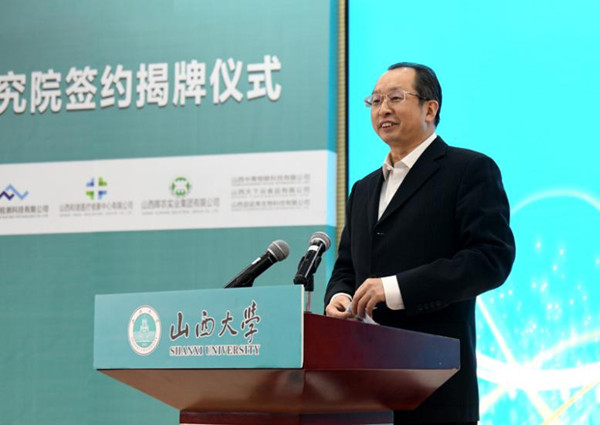 Wang Yixin, vice-governor of Shanxi province, addresses the signing ceremony for industrial technology research institutes jointly established by Shanxi University and Shanxi enterprises on March 5. [Photo/sxu.edu.cn]