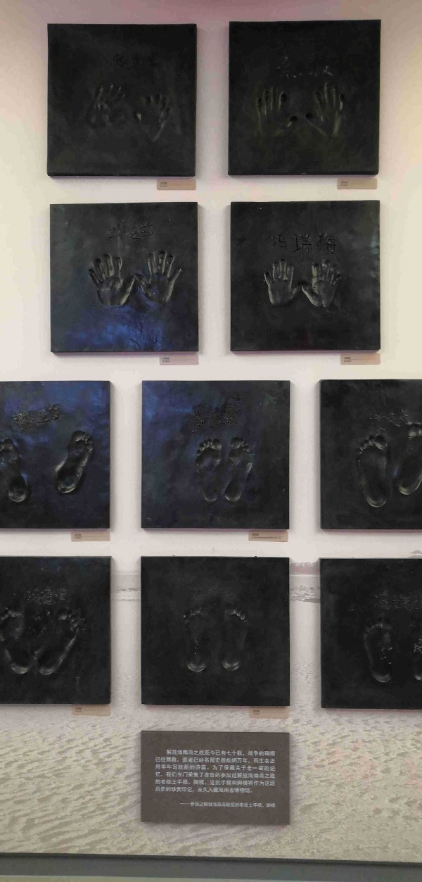 At the memorial hall of the Hainan Island Liberation Park in Lin'gao, a wall featuring bronze-framed fingerprints and the footprints of soldiers who once fought in cross-sea battles and who are still alive, is eye-catching and evokes memories of those arduous yet heroic days of war.
