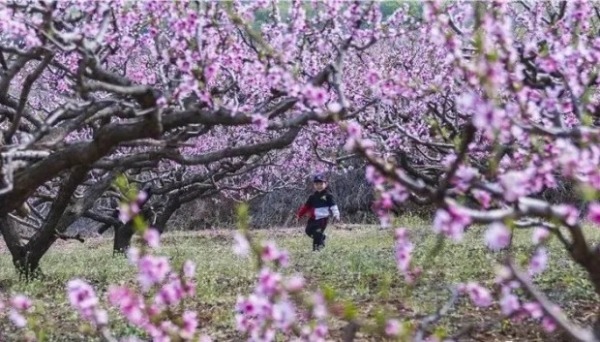 A child walks among blooming peach flowers in Yantai, Shandong province. [Photo by Xiao Cao/WeChat account: ytwlgw]