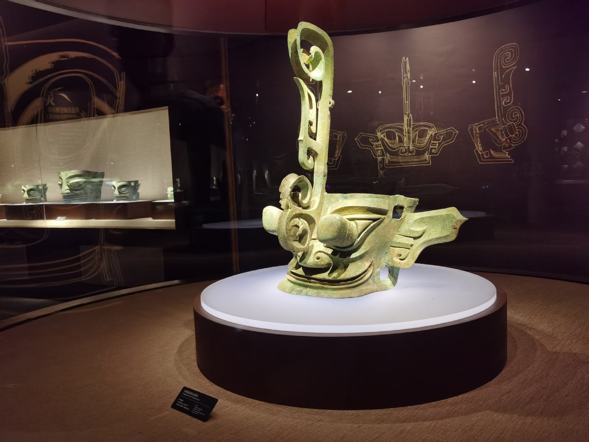 A crested bronze mask with protruding pupils is one of best known artifacts of Sanxingdui site. [Photo by Wang Kaihao/chinadaily.com.cn]