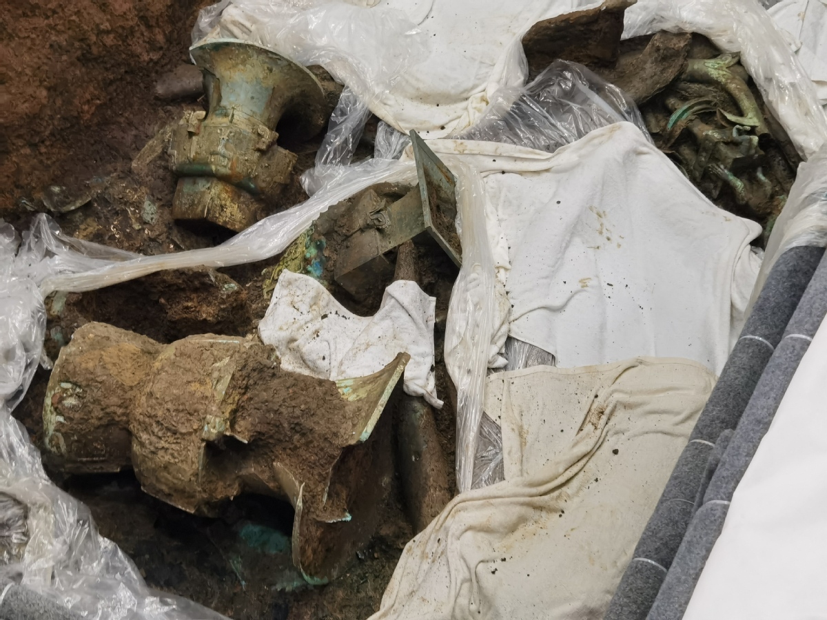 Abundant bronze wares are unearthed in the No 3 sacrificial pit of Sanxingdui site in Guanghan, Sichuan province, on March 19, 2021. [Photo by Wang Kaihao/chinadaily.com.cn]