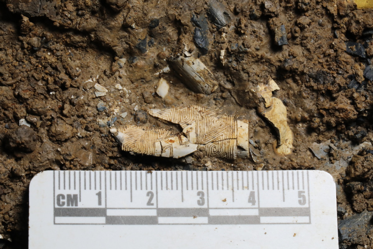 A broken ivory sculpture is unearthed from No 5 sacrificial pit of Sanxingdui site. [Photo provided by Sichuan Provincial Cultural Relics and Archaeology Research Institute]