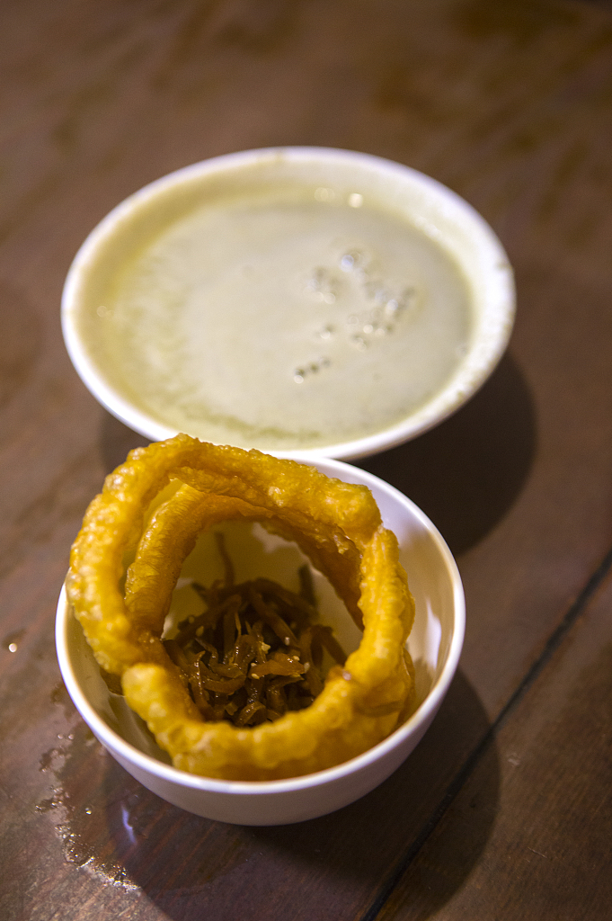 Dou zhi is often served with crispy fried loops ( jiao quan) and a small amount of pickle.[Photo/IC]