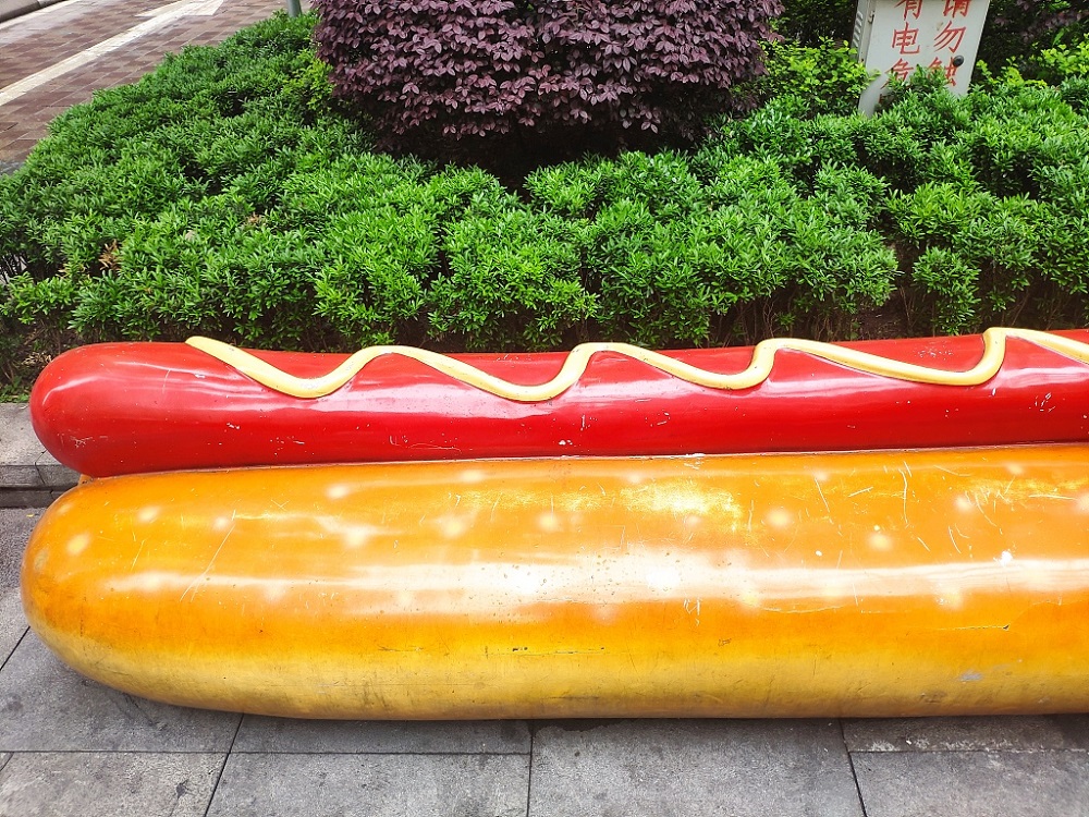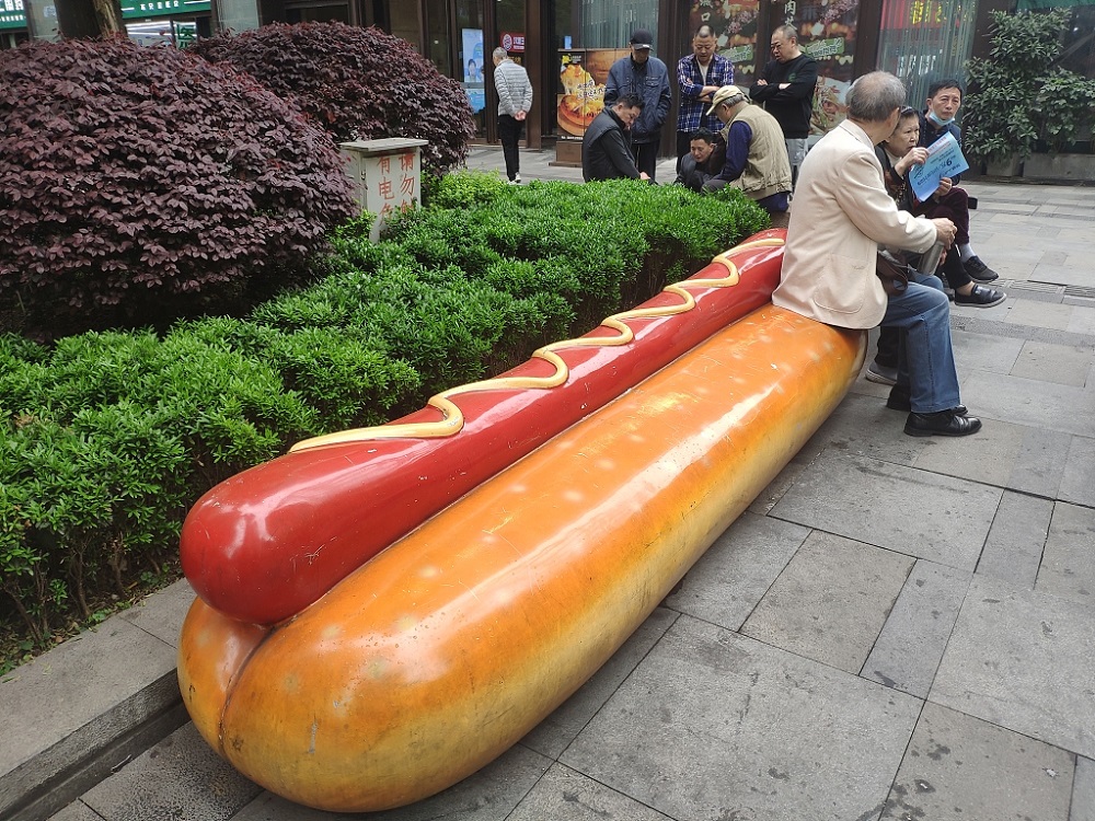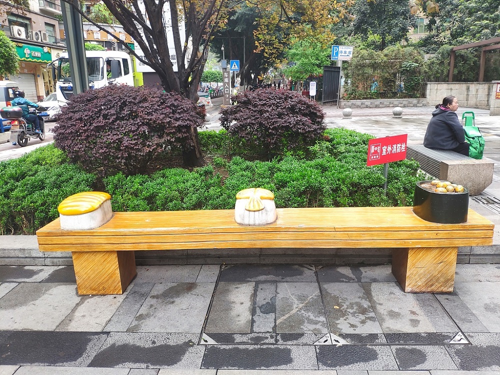 Designed like a hotdog and sushi, the leisure benches in Jiulongpo district, Chongqing municipality, attract pedestrians to sit down and feel the joy of creativity in the midst of hustle and bustle.