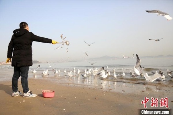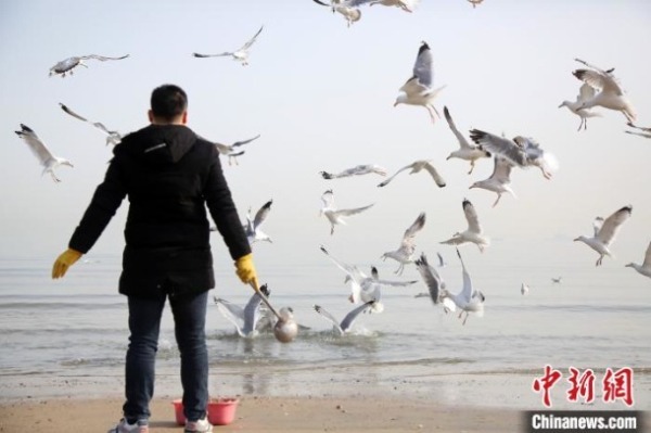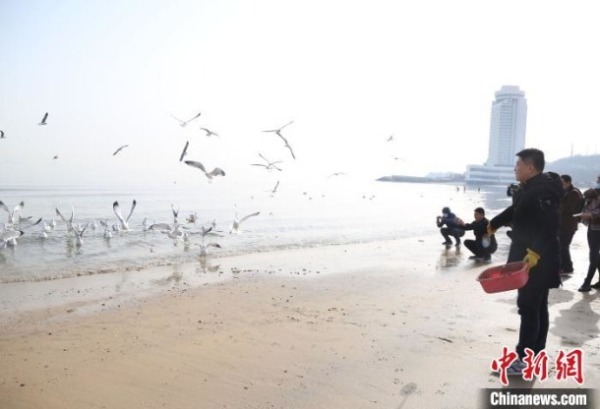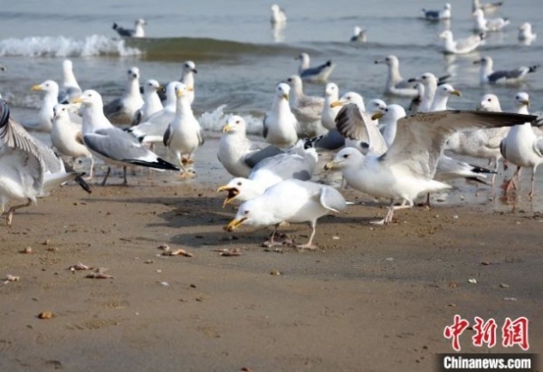 A group of seagulls gather at the seashore of Yantai, Shandong province as a staff member of No 1 Bathing Beach Scenic Area throws fresh fish out to the sea. Flocks of seagulls are a familiar sight in Yantai, a coastal city in East China's Shandong province. [Photo by Wang Jiaoni/chinanews.com]