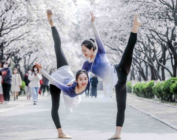 Jinan college students dance around blooming flowers