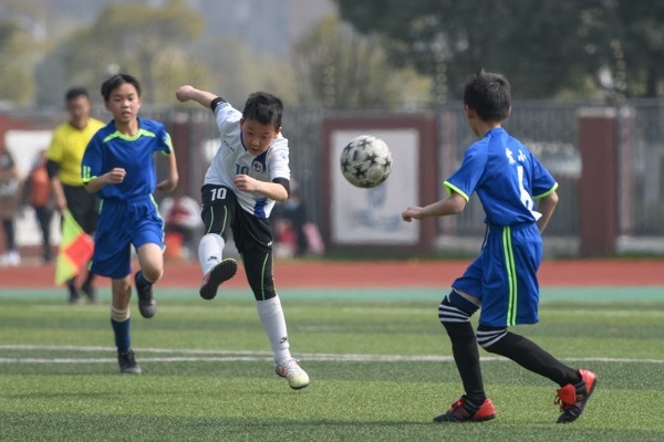 Teenagers compete in the finals of a campus football competition for primary school students in Wujiang district, Suzhou on March 14. [Photo/IC]