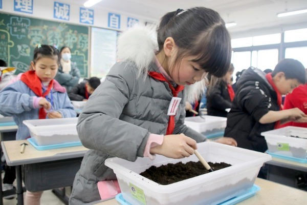 Students from Lujia town, Kunshan try their hands at planting vegetable seeds on March 11. [Photo/IC]