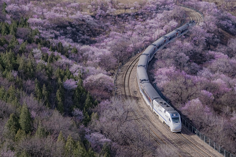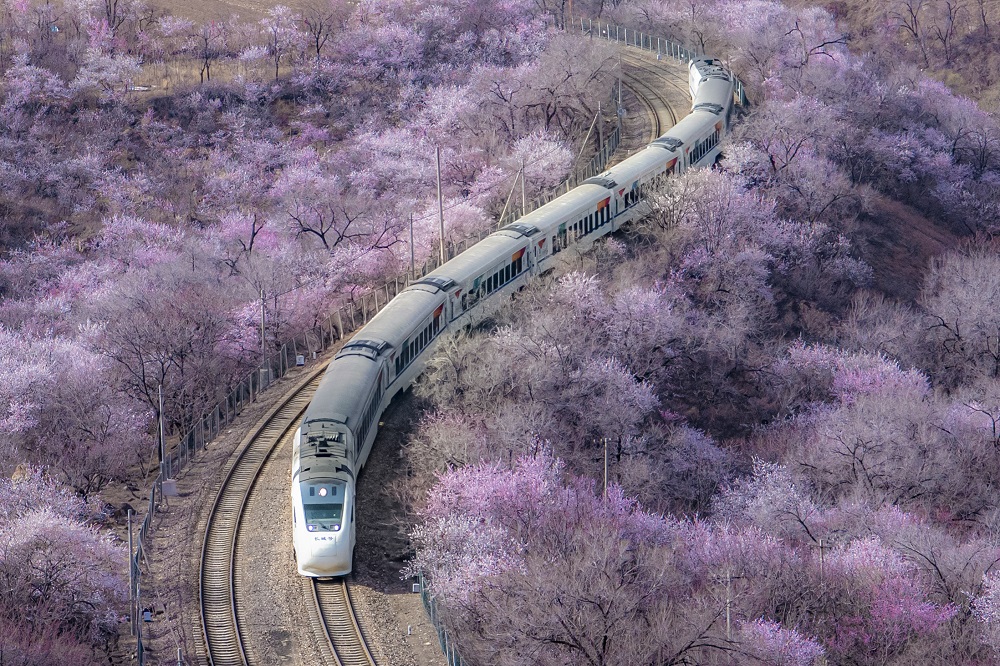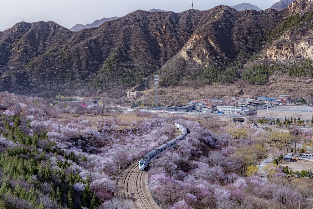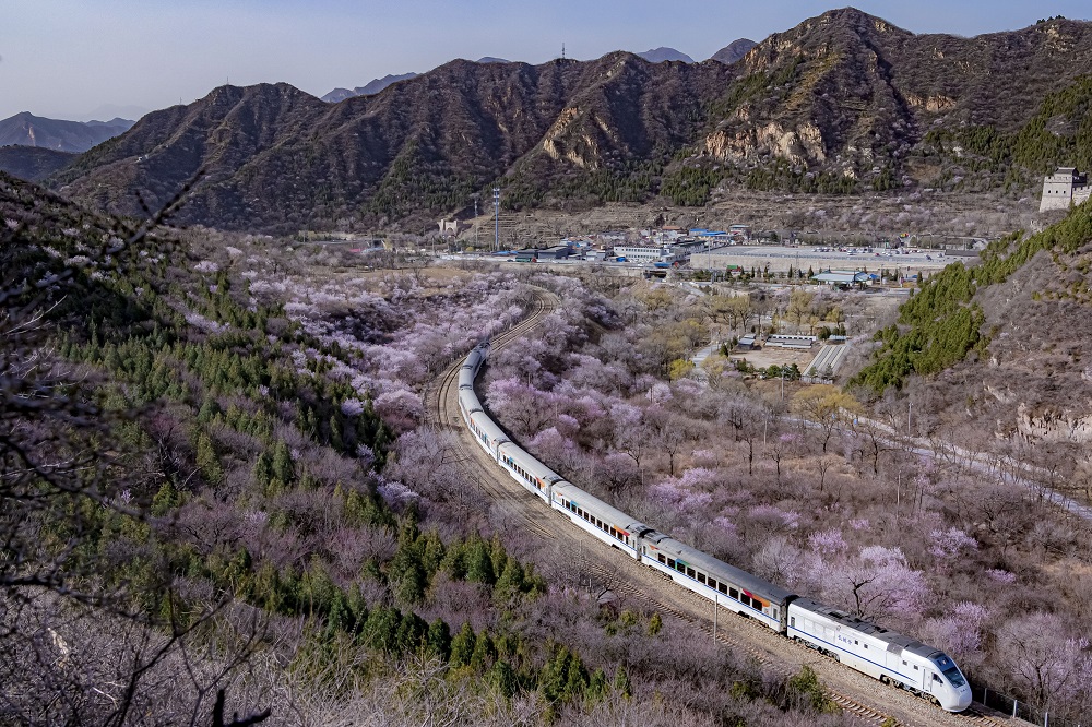 Bustling between Beijing and Hebei province, the high-speed train flashes past the Juyongguan Great Wall, creating vibrant spring memories.