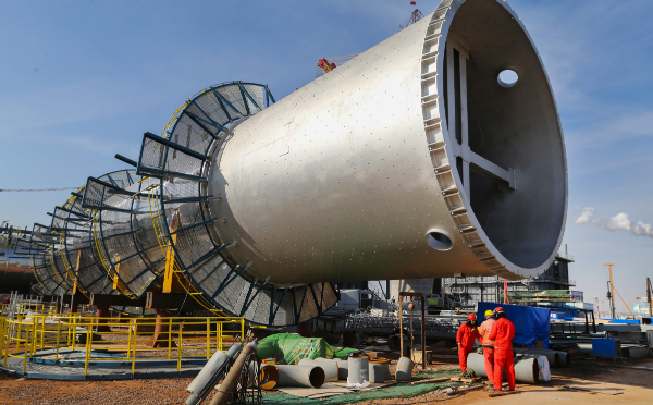 Workers carry out tasks relating to construction of a refinery project at a petrochemical industry base in Lianyungang, Jiangsu province. [Photo by Wang Jianmin/For China Daily]