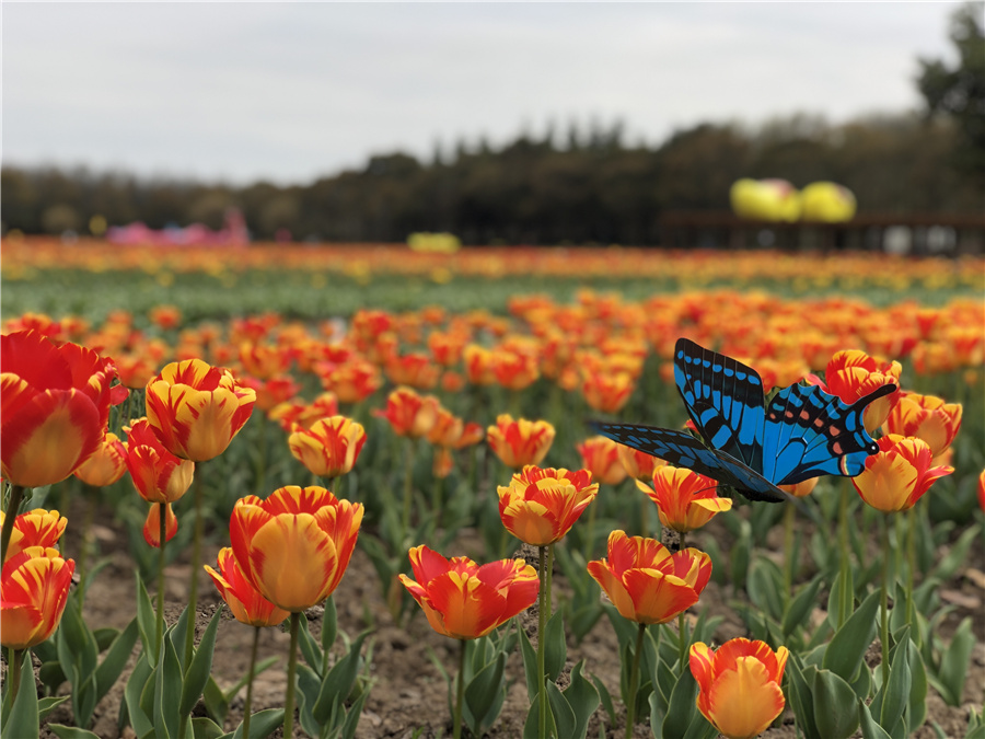 Tulips are on show at Hongqiao Huaxiang, a 10-hectare park and flower production base featuring various tulips introduced from the Netherlands. [Photo by Xing Yi/chinadaily.com.cn]