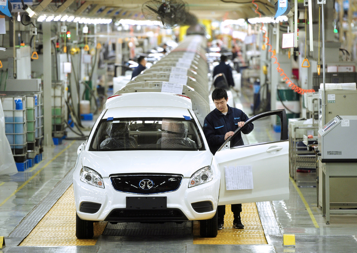 Staff members work at Beijing Electric Vehicle Co's assembly line in Huanghua, Hebei province. Over 462,000 charging pillars were constructed for electric cars in China last year. [Photo/XINHUA]