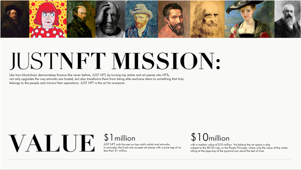 The principle team of JUST NFT Fund consists of art market experts from traditional institutions including Christie's and Sotheby's. Responding to criticism that more and more low quality artworks have entered the NFT sector, the JUST NFT fund tends to set a threshold for selection of works of art based on estimated long-term market value.