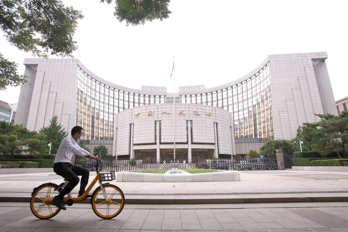 A cyclist pedals past the headquarters of the People's Bank of China in Beijing. [Photo by CHEN XIAOGEN/FOR CHINA DAILY]