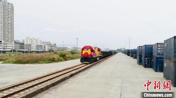 A freight train loaded with eight cold chain containers departed from Fangchenggang Station in Guangxi Zhuang autonomous region on March 30, and is expected to arrive in Chongqing's Jiangjin in three days.