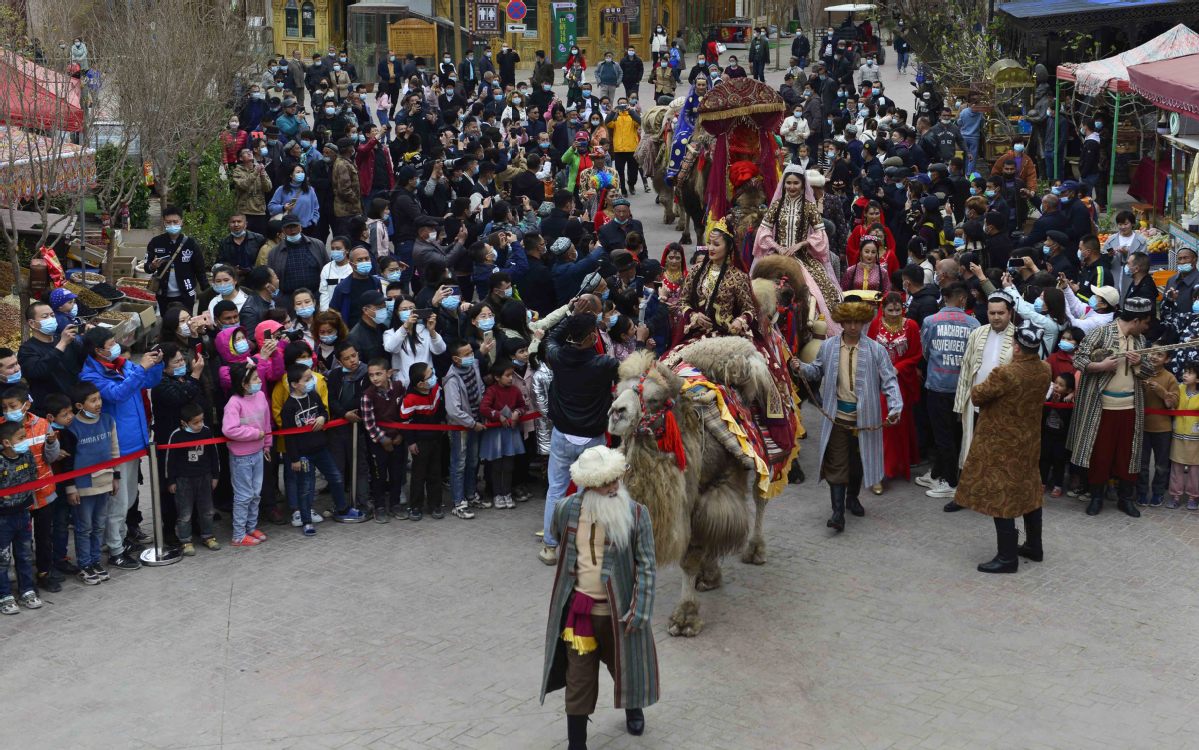 Tourists watch a camel show in Kashgar, Xinjiang Uygur autonomous region, on Sunday. China has seen an increase in people traveling during this year's Qingming Festival, Tomb Sweeping Day holiday, which was from Saturday to Monday. [Photo by Adiljan/China News Service]