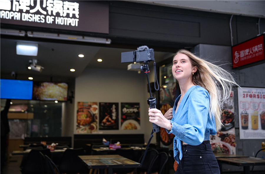 Amy makes video diary on Chinese food in front of a hotpot restaurant in Sydney, on March 16, 2021. [Photo/Xinhua]